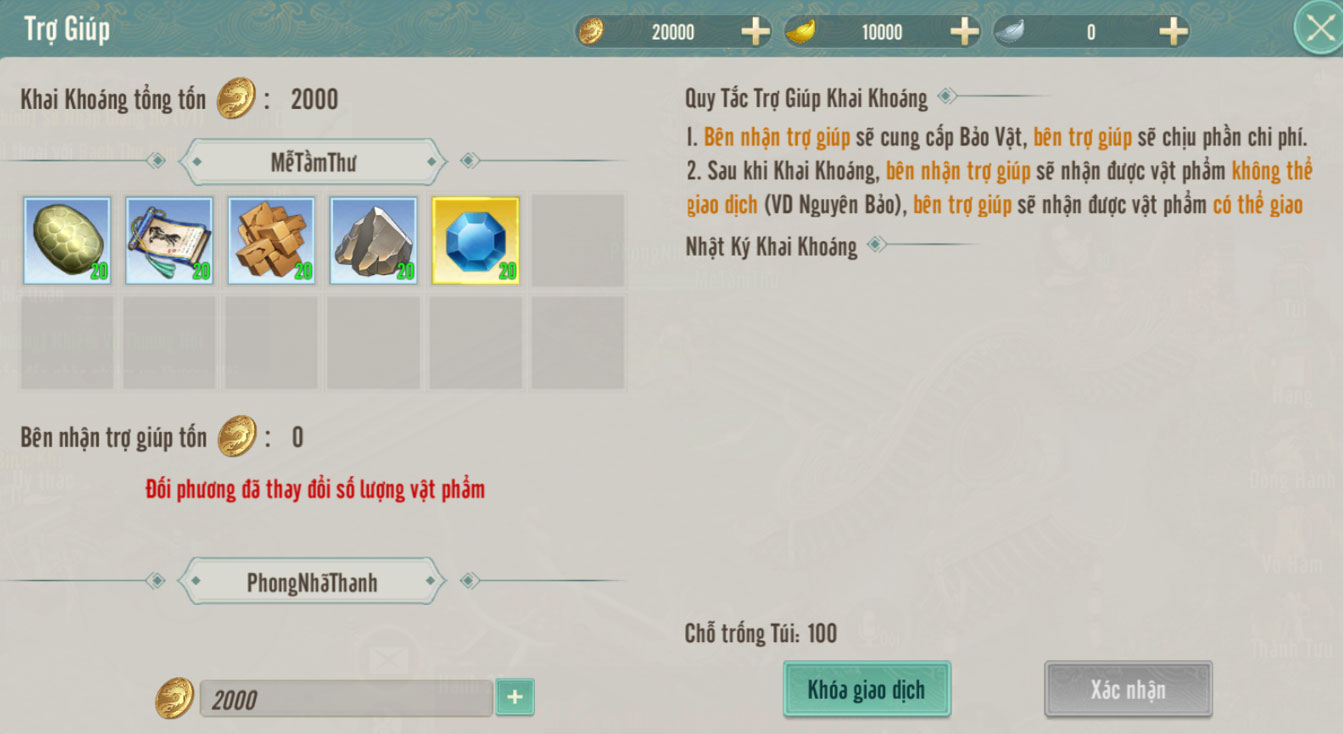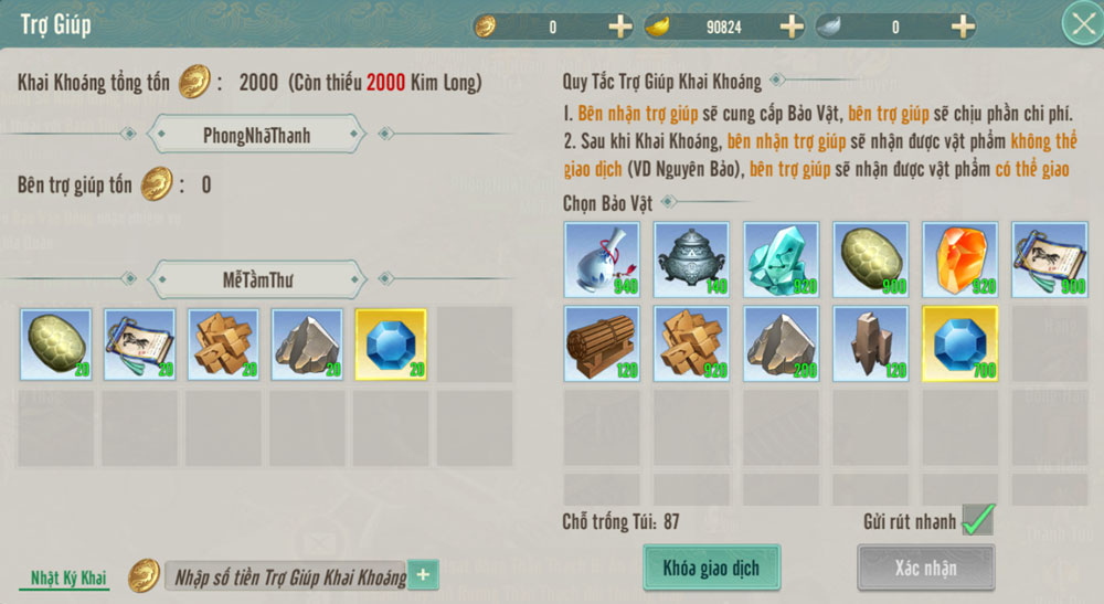- Người trợ giúp sẽ cần nhập số tiền Kim Long tương đương với chí phí cần dùng để khai khoáng số lượng Bảo Vật mà người nhận trợ giúp đã đặt vào.