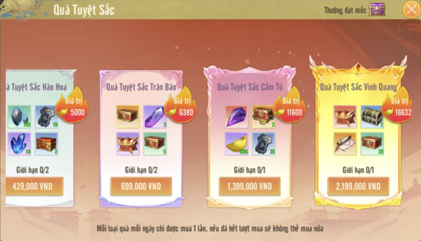 - Trong thời gian trên, tại giao diện Quà Tuyệt Sắc sẽ hiển thị các gói mua hấp dẫn, mang đến cơ hội sở hữu những bảo vật quý hiếm.
