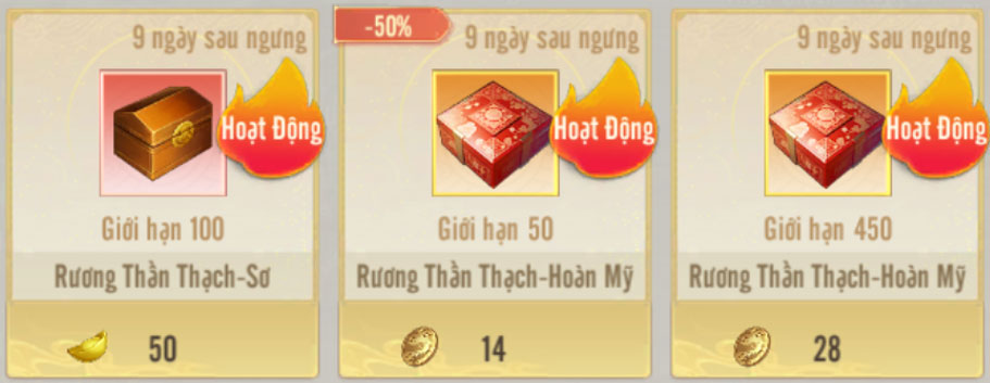 - Trong thời gian diễn ra hoạt động, Kỳ Trân Các mở bán các Rương Thần Thạch bằng giá Nguyên Bảo và Kim Long.