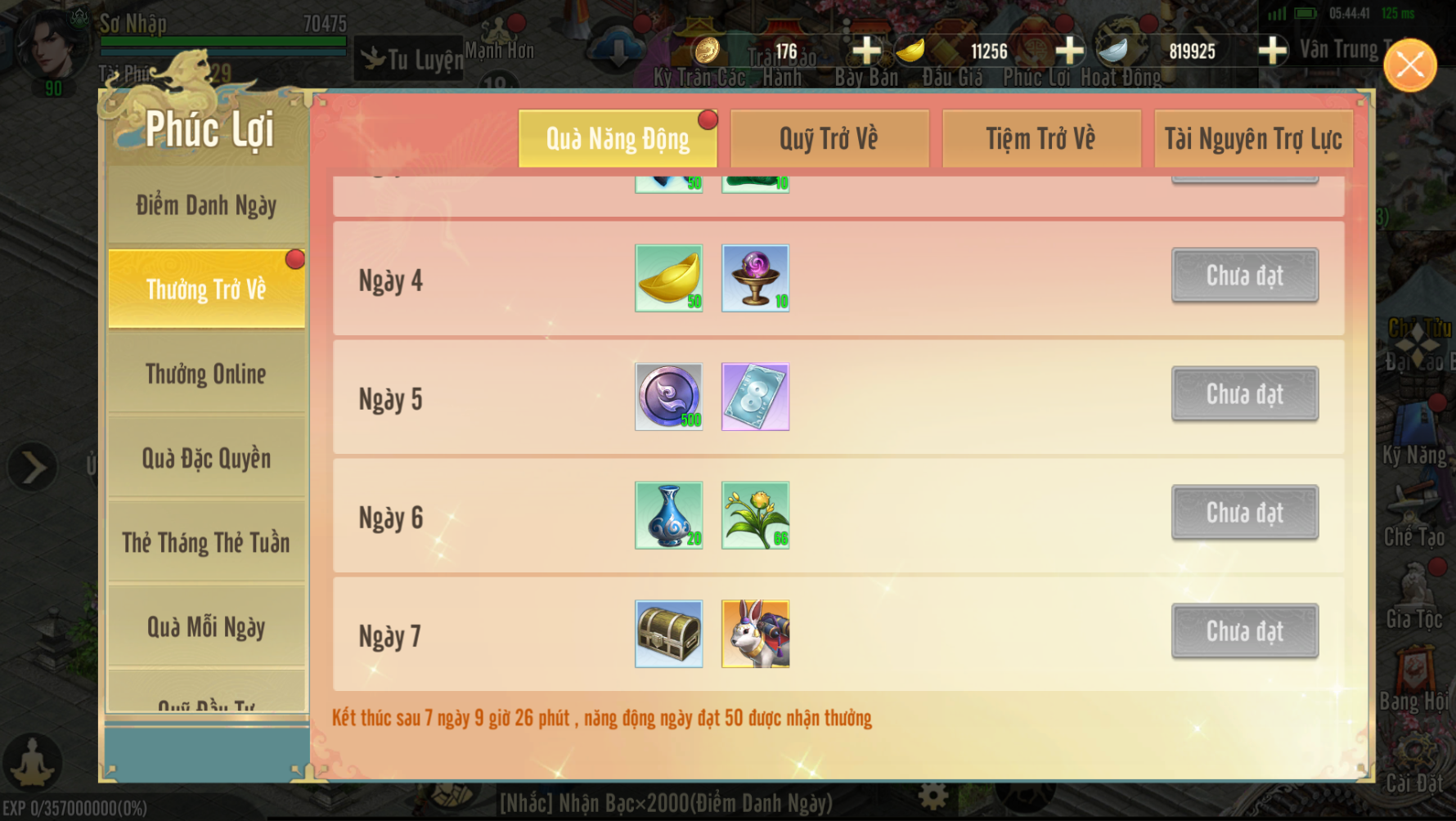 - Trong vòng 7 ngày đầu tiên kể từ khi đăng nhập trở lại, hằng ngày khi năng động đạt 50 sẽ nhận được thưởng tài nguyên.