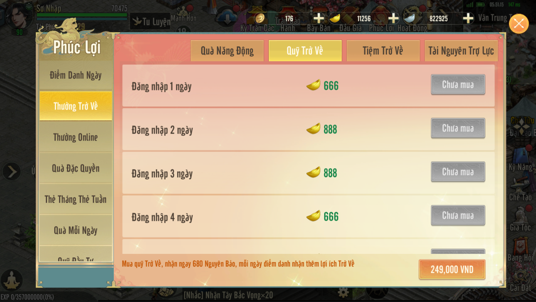 - Trong thời gian nhận trạng thái Trở Về, có thể mua gói Quỹ Trở Về để nhận được lợi tức Nguyên Bảo dồi dào.